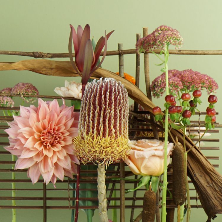 Banksia baueri, Banksia, Dryandra, Dianthus caryophyllus, Zingiber, Sansevieria, Celosia, Typha latifolia, Pennisetum, Strelitzia, Erica, Leucadendron, Asparagus