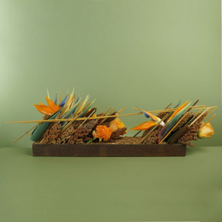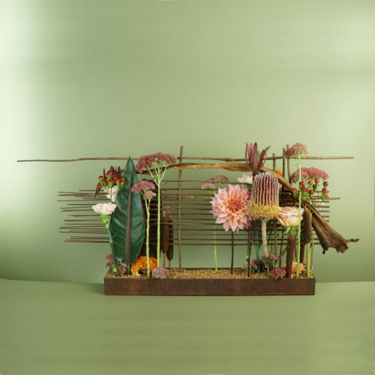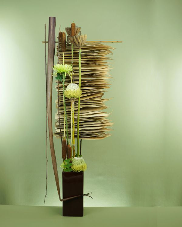 Minimal use of green and extensive use of sorghum, tingting sticks, bullrushes and lentils makes this design mostly about brown. Working on an angle like this forces you to pay more attention to the linear qualities of the material, to create a strong impression of parallelism.