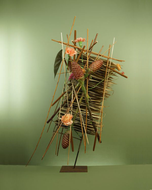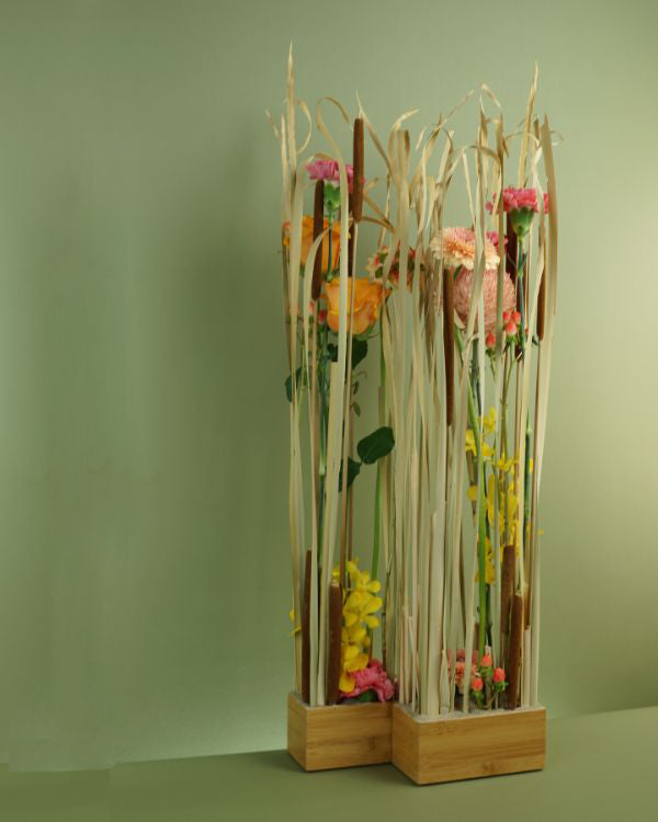 Two parallel systems, the vertical having the actual floral materials and a horizontal one with a decorative screen of bamboo leaves at the back.