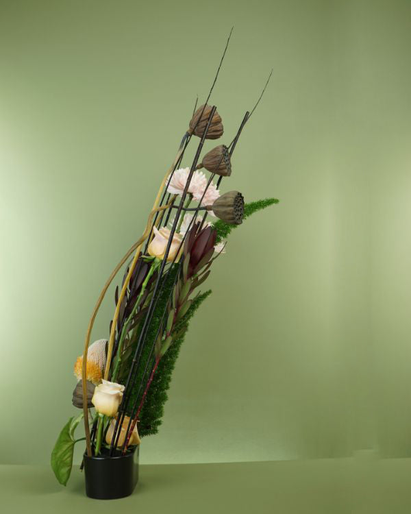 Nelumbo nucifera, Asparagus, Rosa, Banksia burdettii, Chrysanthemum, Leucadendron, Syngonium, Salix