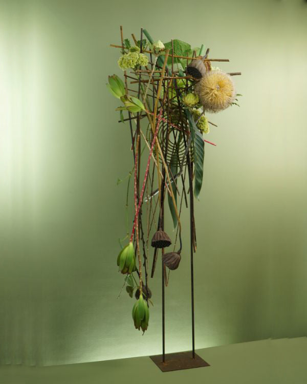 Comprised of two different systems, the underlying foundation of two bottles with tatami screens is parallel, but the actual flower placements are overlapping.