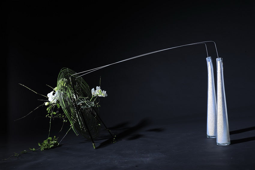 A transparent base structure of Elegia stems is contrasted with a ribbon of compacted Elegia foliage, adding an immediate sense of depth and offering a distinctly textural impression. Kathryn took this contemporary approach to one of the tasks in Flower Thinking’s Design Solutions program.