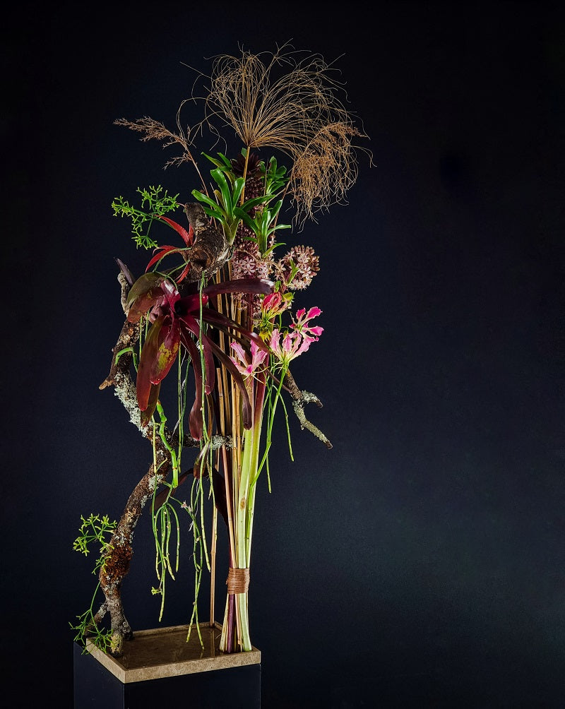 Built around a Lichen encrusted branch, this innovative approach to a hand tied bouquet is not only high in its aesthetic impact; it also employs sustainable materials and methods. It was created by Duc Thuan Bui for the International Master Florist program offered by The Boerma Instituut in The Netherlands.