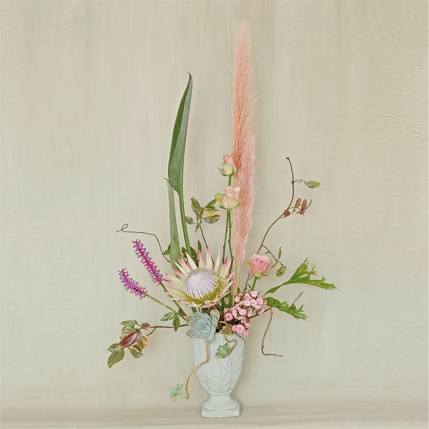 Protea cynaroides, Echeveria, Cortaderia selloana, Strelitzia, Bromeliad, Rosa