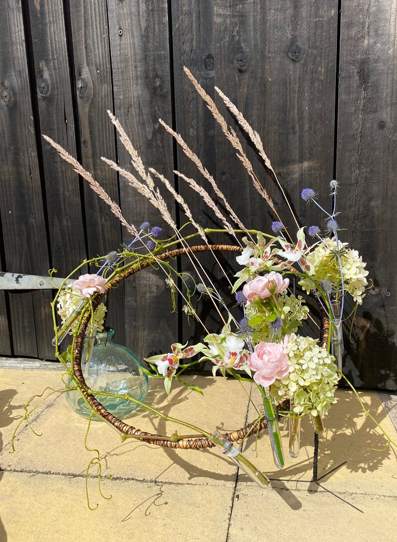 The first inspiration was the hoop, this then led the design shape followed by the blue bottle linking to the blue Eryngium sp.