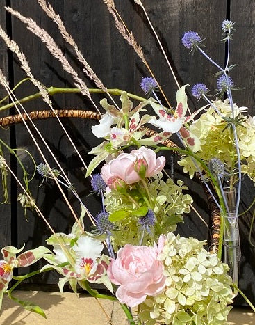 Rosa sp, Eryngium sp, hydrangea paniculata, orchid, grass, grape vine