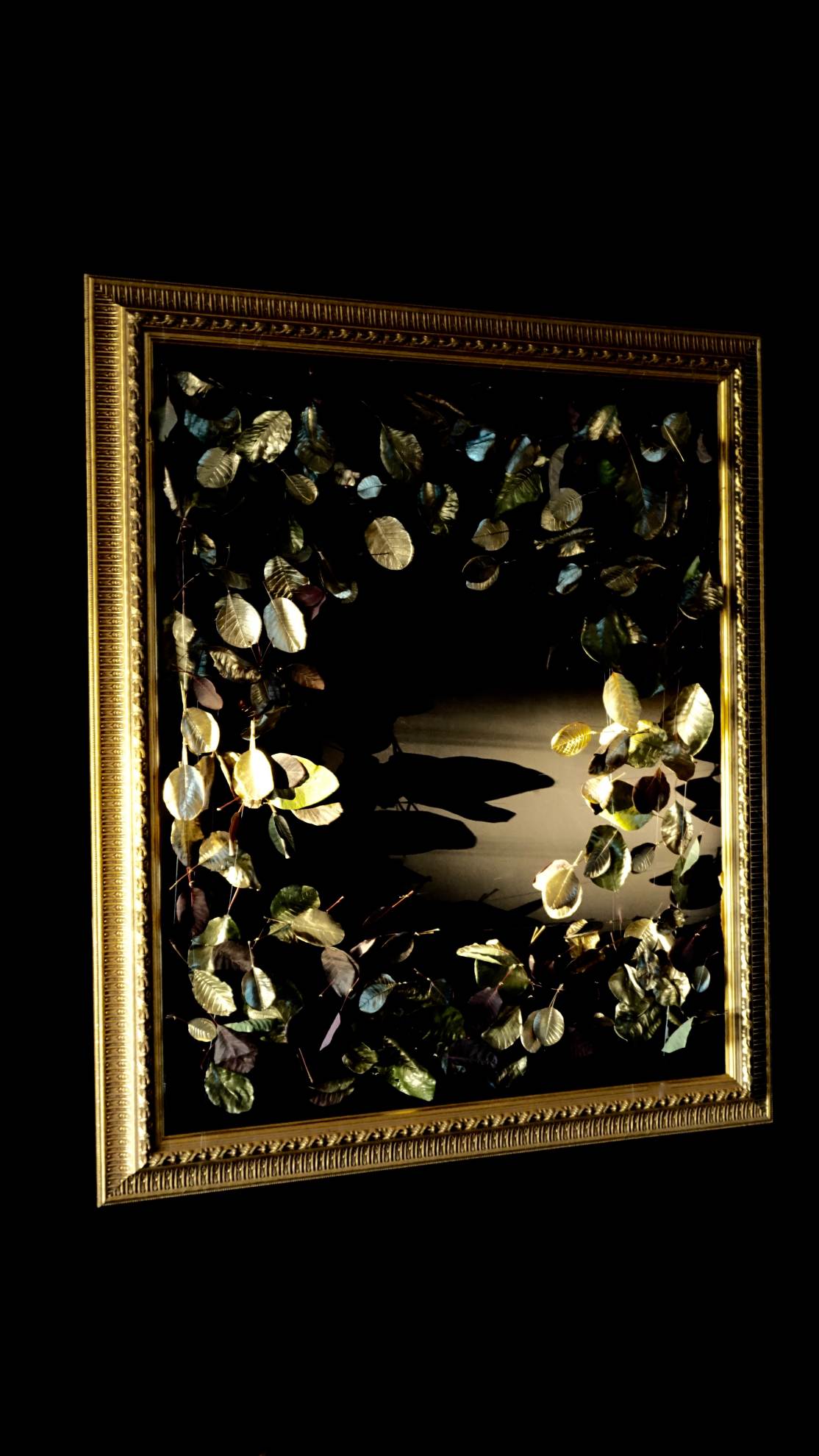 Beech leaves, with various decorative treatments are suspended within a gilded picture frame to form a dramatic circular void