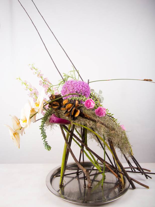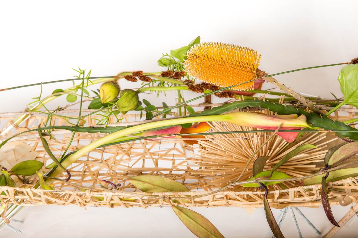 A screen of interwoven raffia, held aloft on a log of Eucalyptus, supports an unexpected combination of Indigenous and exotic botanicals
