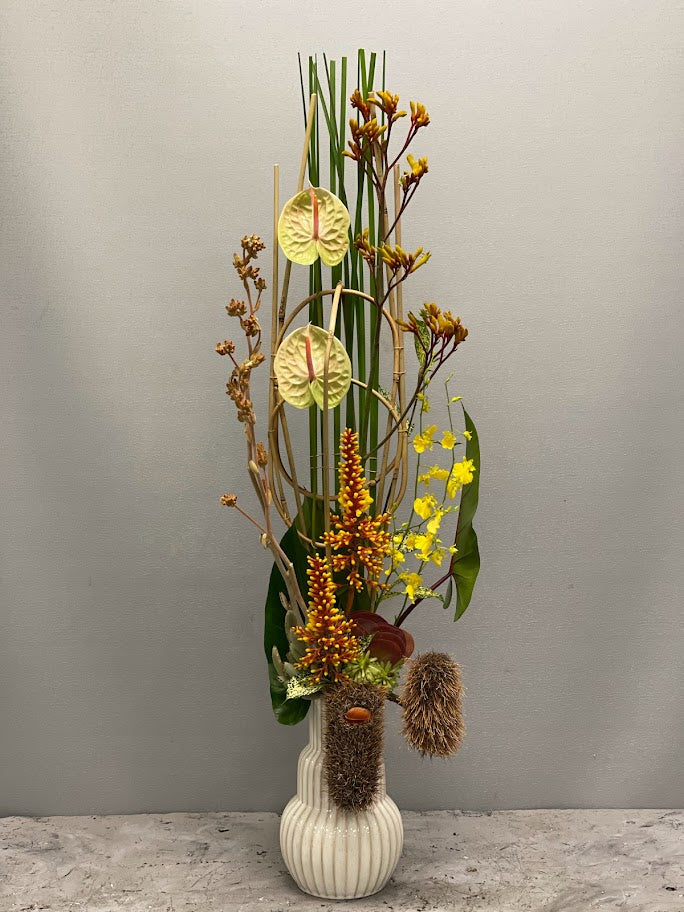 Kangaroo Paw, Anthurium, Dancing Lady Orchid, Bromalide, Banksia, Philodendron, Spear Grass