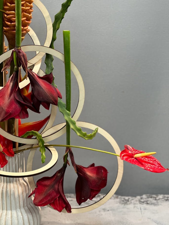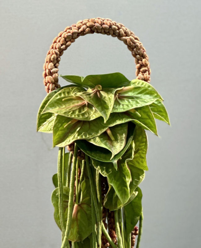A wreath is the base for the anthuriums. Medallions of dried beans give a focal point. Wire is inserted into the snake beans to allow for manipulation to enhance the curved nature of the stems.