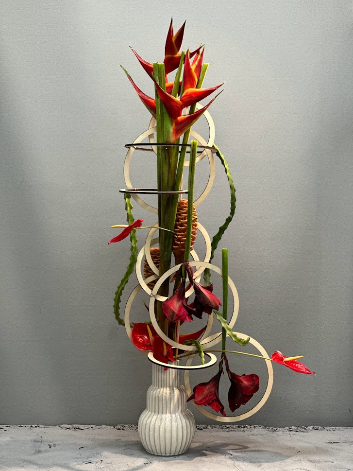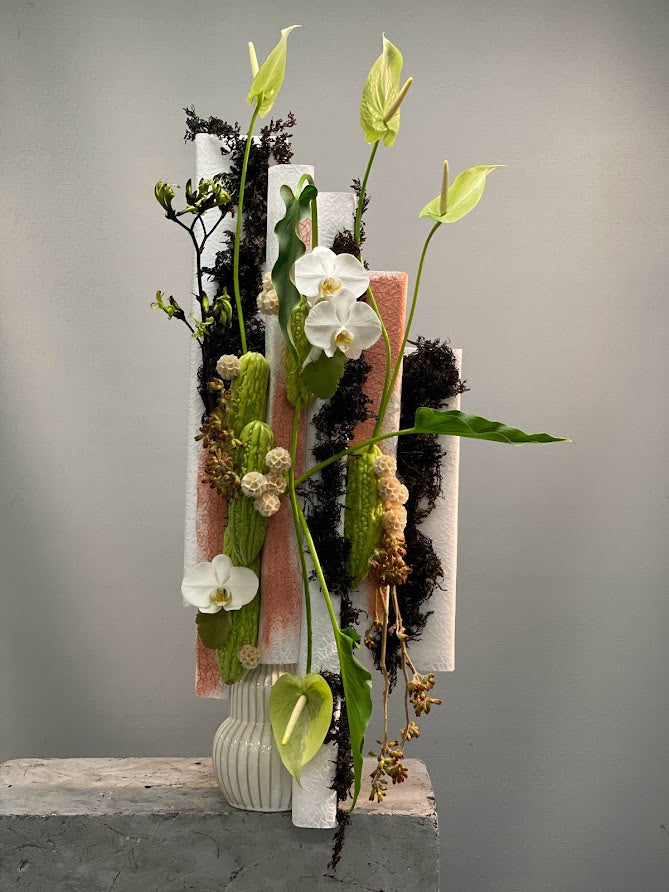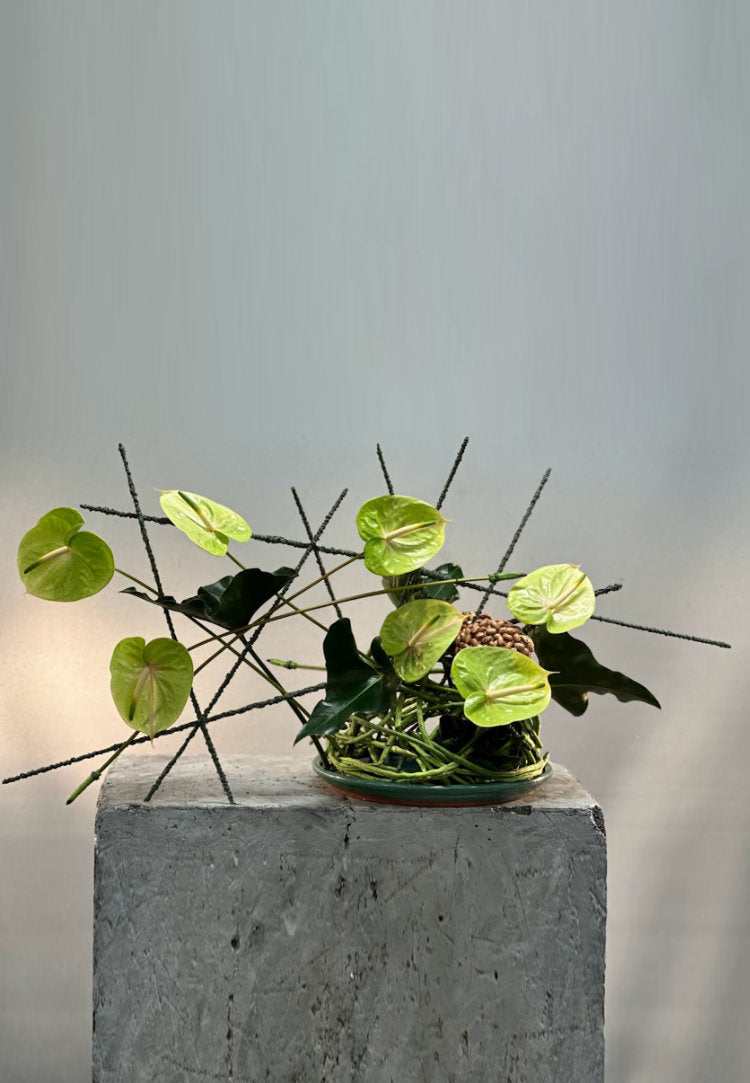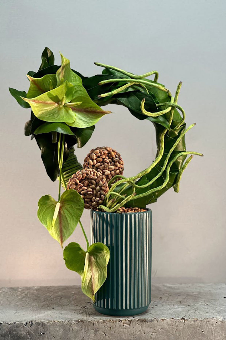 A low, overlapping design of Anthuriums and Snake Beans. Fresh Beans are constructed into an interwoven dome that is at the core of the design. A medallion of dried Beans is tucked behind some lower flowers to add greater depth and spatial contrast.