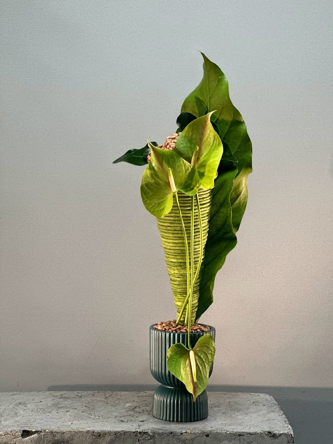 An inverted cone is covered with the snake beans. It rests on a base of dried beans. A anthurium leaf gives a background to the anthurium flowers, one of which is inverted to draw the eye to the base.