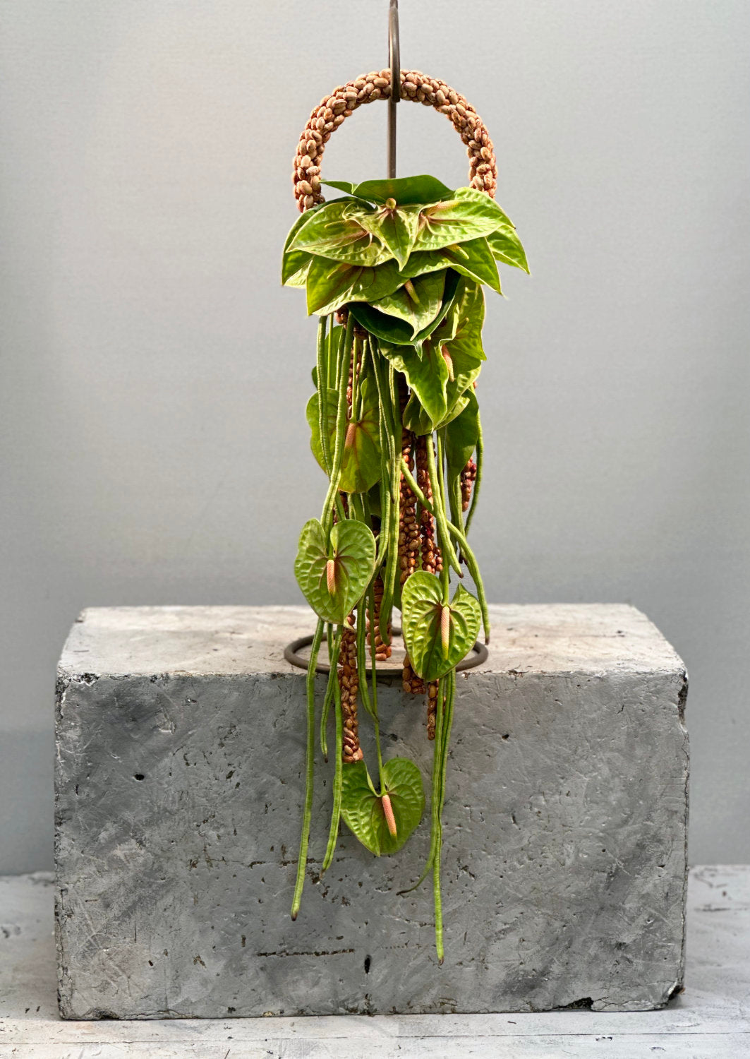 A hoop of dried beans forms the carrying point of the bouquet. Beans are wired and attached to the hoop. The anthuriums form a canopy. Ribbon is covered in dried beans and adds trailing lines to the bouquet.