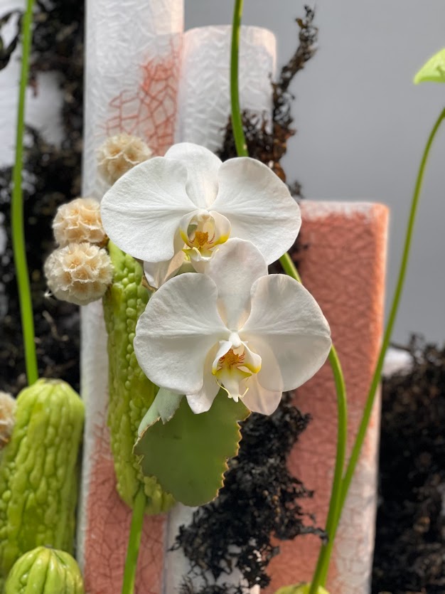 "Design Solutions saw a different approach where only two materials were to be used. This was challenging for me as I like to work with a variety of materials. Using my previous studies with Mark as a guide I chose beans and anthuriums. Using all parts of both plant materials. Including the seeds and leaves of the plants. A great experience it, pushed my creativity. I found a different perspective of the value of all parts of the plant."