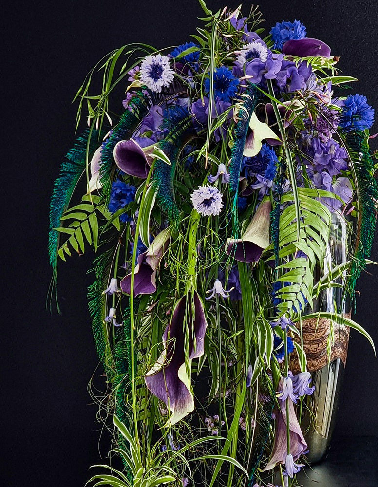 I am often amazed by how a few thin lines of grass can uplift and transform a dense floral composition. At times, elements within the same category, such as the colours blue and magenta, may seem contrasting, yet their relationship is not paradoxical; rather, they support and complement each other.
