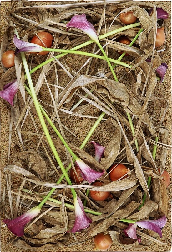 Placements of Zantedeschia and brown Onions on Lentils and Turmeric Leaves